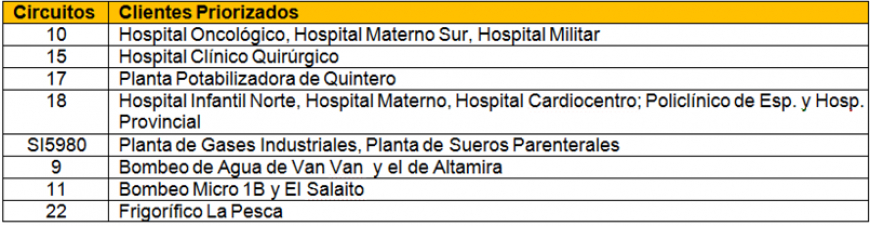 Por este motivo estos son circuitos priorizados y no están dentro de los bloques que conforman la programación; no obstante, pueden tener afectación en un momento determinado por alguna avería o cuando el déficit de generación supere la capacidad del bloque programado, siempre previa coordinación con estos centros para evitar imprevistos que afecten en el plano económico, o paralicen algún proceder de urgencia en los centros de salud.