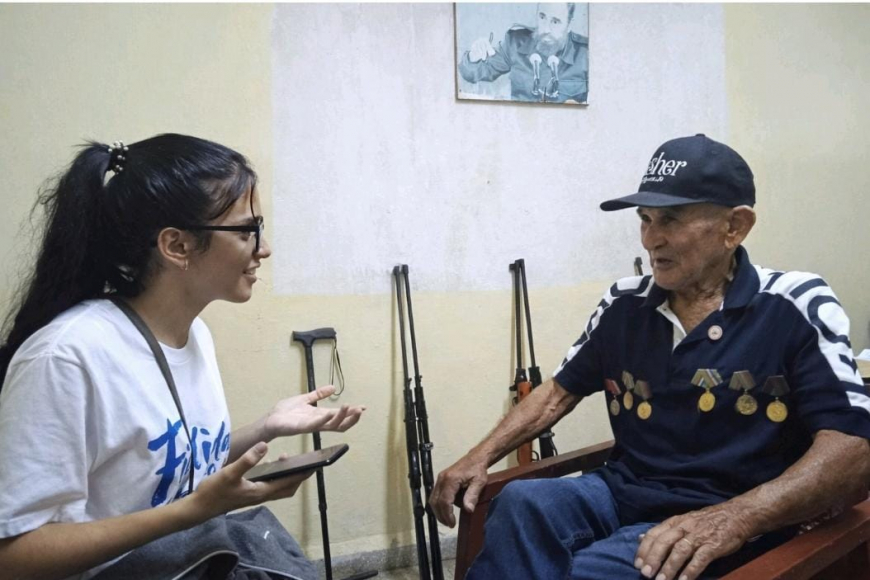 Hace una pausa, medita en el instante que se toca el mentón y dirige su vista hacia la imagen de Fidel en el cuadro, suspira diciendo “el Comandante”, pero sigue: “vi a un hombre grande, andaba montado en un tanque que venía a donde estábamos. Yo estaba tranquilo, pero cuando me doy la vuelta que veo, era el señor Fidel Castro”.