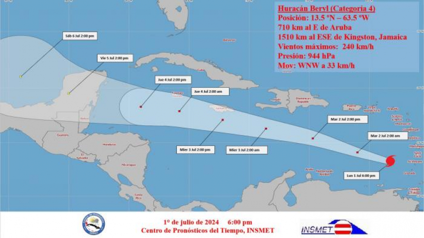 En las próximas 12 a 24 horas el huracán Beryl continuará con similar rumbo y dirección, mientras continúe con similar intensidad sobre el mar Caribe oriental. Sin embargo, algún debilitamiento debe experimentar una vez que se adentre en el mar Caribe central los próximos días.