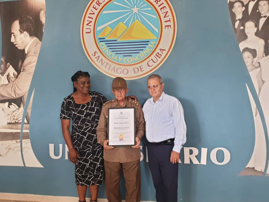 En reconocimiento a su valerosa hoja de servicios a la Patria, especialmente su labor en la preservación de la memoria histórica de la última etapa de luchas entre las nuevas generaciones, el Primer Coronel Alberto Vázquez García recibió, este sábado, la Condición Académica de Doctor Honoris Causa en Ciencias Históricas de la Universidad de Oriente.