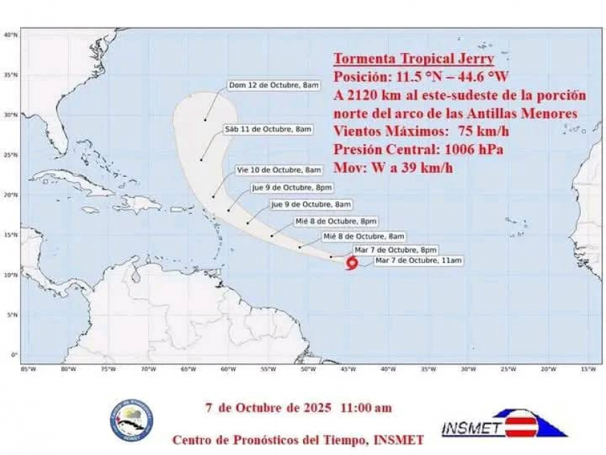 El área de bajas presiones que se encontraba en el océano Atlántico central, al este del arco de las Antillas Menores continuó ganando en organización e intensidad y a las once de la mañana de hoy se convirtió en la Tormenta Tropical Jerry. Su centro se ubicó en los 11.5 grados de latitud Norte y en los 44.6 grados de longitud Oeste. Esta posición lo sitúa a unos 2120 kilómetros al este-sudeste de la porción norte del arco de las Antillas Menores.